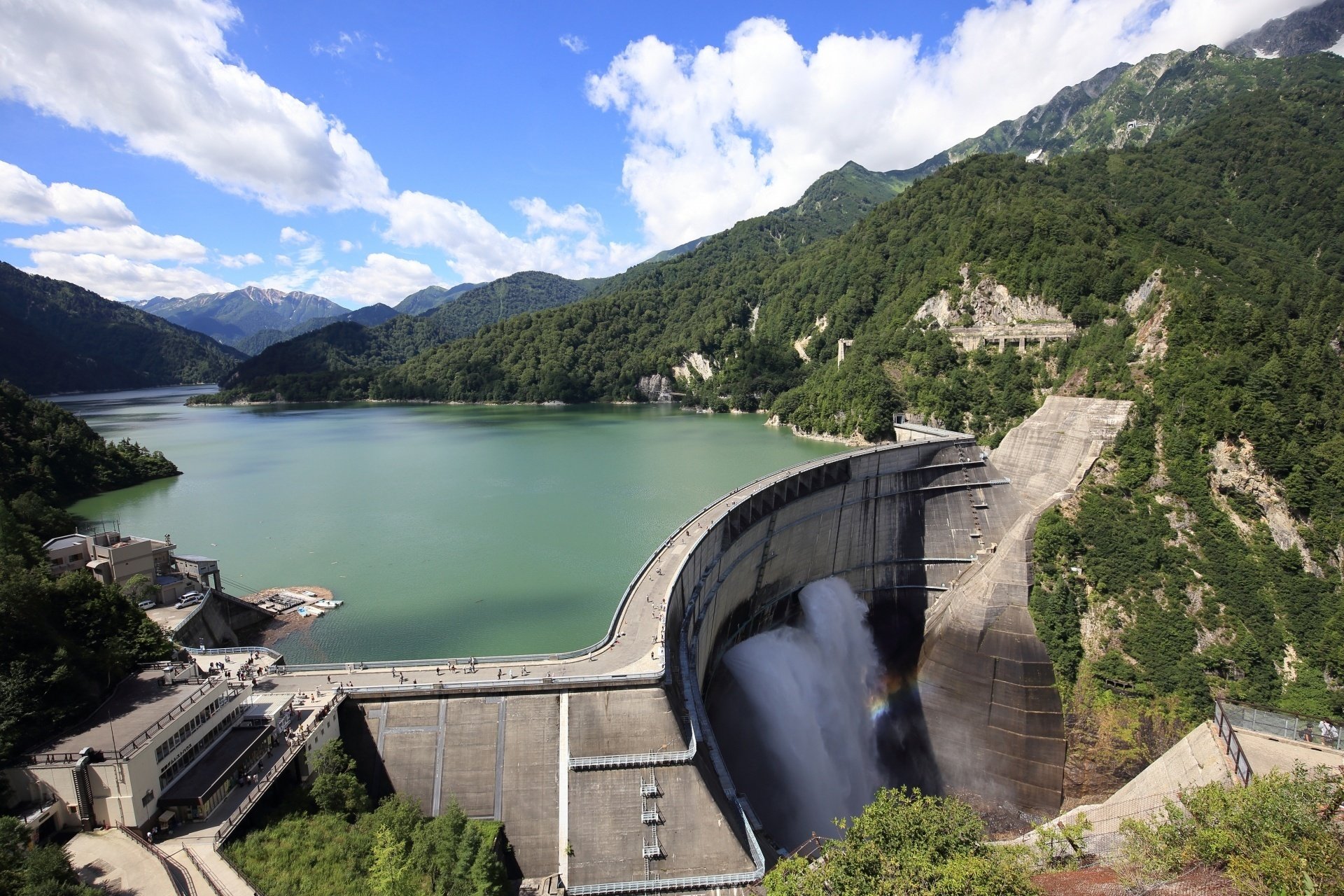 ダムの上は通路となっている。ダムが放水していると、流れでる大量の水を間近で見られる。音がすごい。遠くに目をやると山の景色を楽しめる。